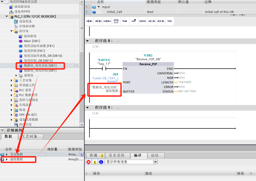 - 4. Click the Data Block and drag the receiving data into the Receive_P2P instruction BUFFER.