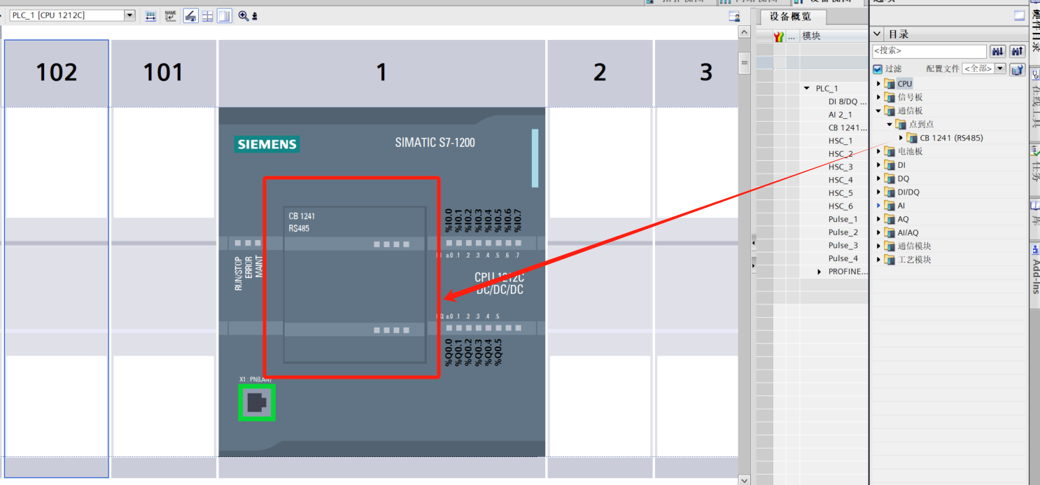 - 1. In device configuration, add the PLC model and add the CB 1241 (RS485) communication board.