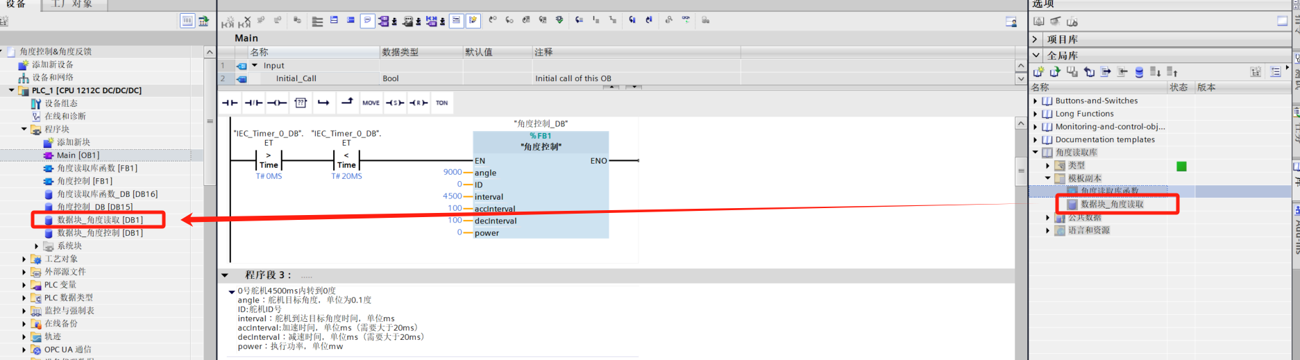 - 2. After opening, you should see it added. Drag the FB (function block) into your program and fill in parameters. Drag the Data Block to the leftmost program block.