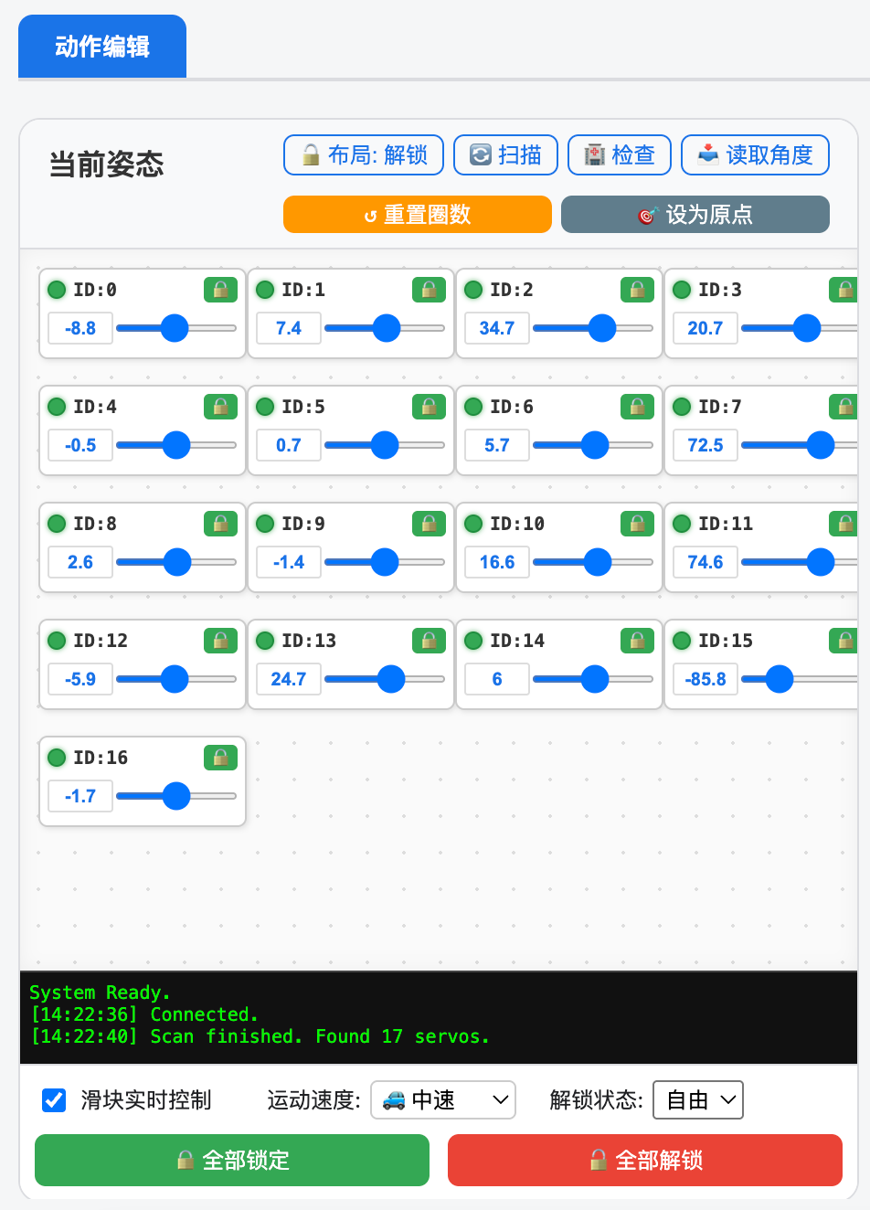 - Layout: Unlocked: Drag each servo card freely so the layout matches the robot's actual structure and joint positions.