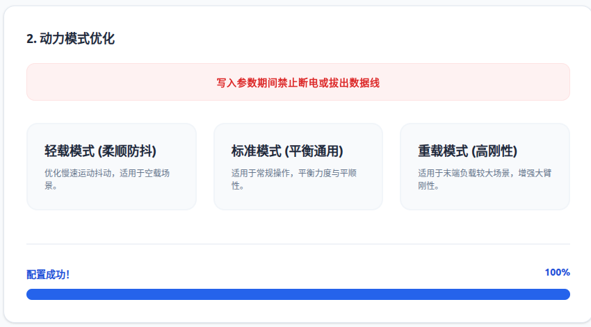 | Robotic arm running without payload | Light Load Mode | Less jitter and smoother motion |