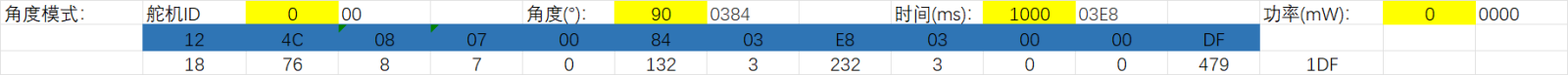 In the attached sheet below, yellow cells are input fields. Example: Servo ID = 0, Angle = 90°, Time = 1s, Power = 0 (no limit).
