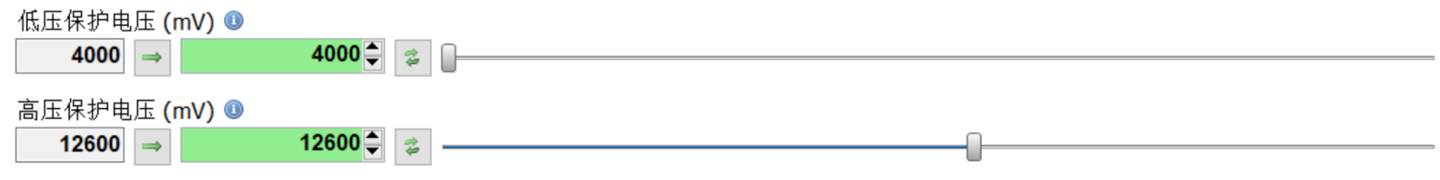 注意:由于部分电源上电速度较慢,可能触发低压保护。建议将低压保护阈值设定为4000(mV),以减少误触发的可能性。设定过高的高压保护阈值,会造成内部元器件不可逆的损坏,建议不要随意修改出厂设定。