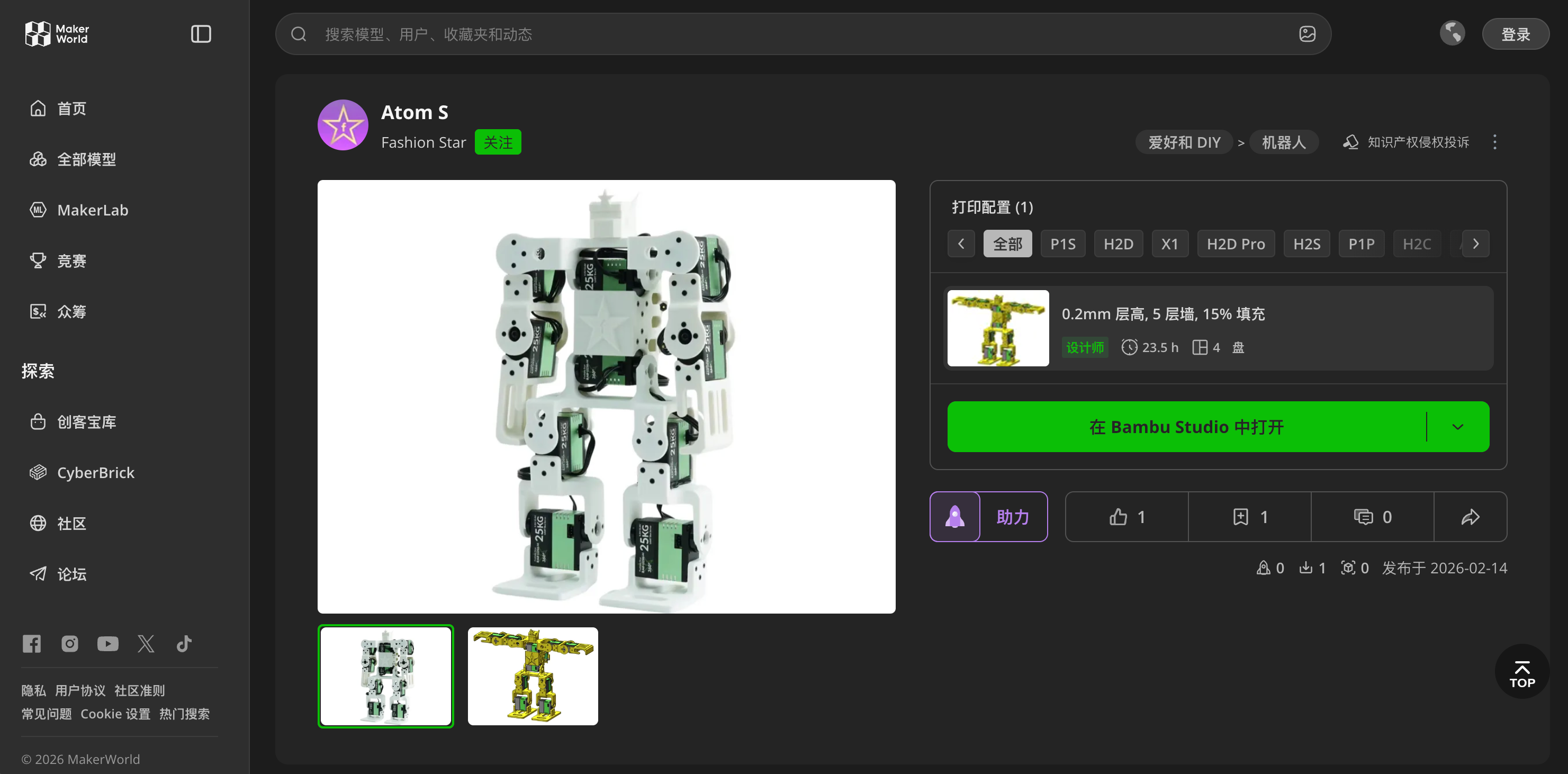Atom S(10 自由度)|图纸与模型下载 获取完整的 3D 打印数据,请访问: MakerWorld 模型页面 说明 我们将于稍后陆续提供更完整的装配视频与图文说明,敬请关注本页面更新。 本页内容对您有帮助吗? 感谢您的反馈! 感谢您的反馈!
