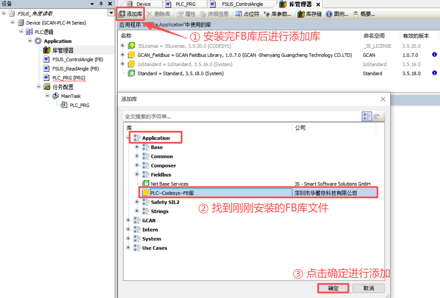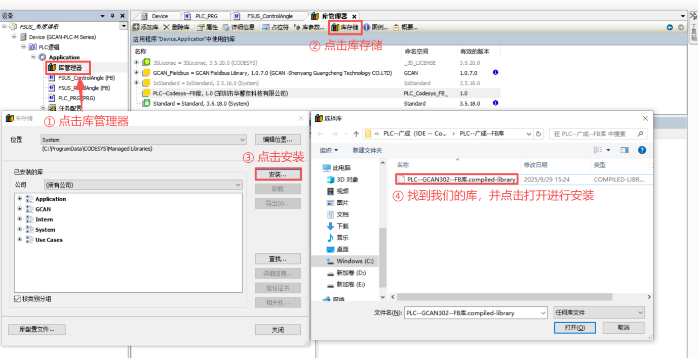 - 1. 在”Codesys”工具中找到库管理器,点击库存储,接着进行FB库的安装。
