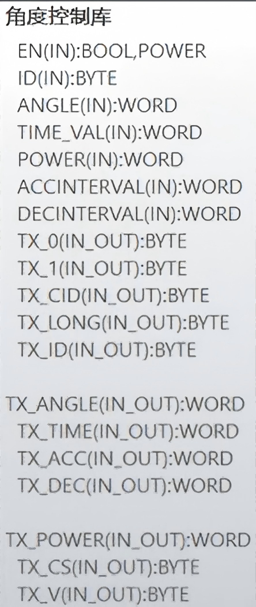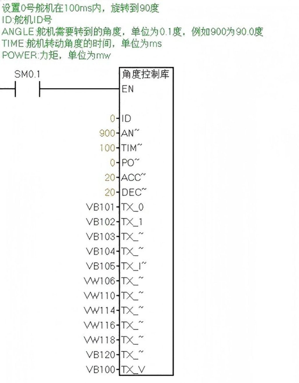 以“角度控制库”为例,TX_0~TX_CS为实际发送的协议寄存器,BYTE占一个字节,WORD占两个字节(可以看下图“角度的控制库寄存器说明”);需要注意的是在“角度控制库”中ANGLE和TIME这里要占四个寄存器,其他以“角度的控制库寄存器说明”的数据类型为准,TX_V为寄存器头,例如VB100、VB200、VB300......(具体可以看下文例程)