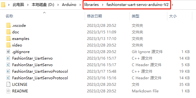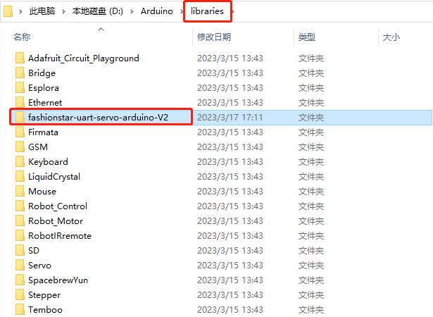 将fashionstar-uart-servo-arduino-V2这个工程文件,整体拷贝到Arduino IDE安装路径下的libraries这个文件夹