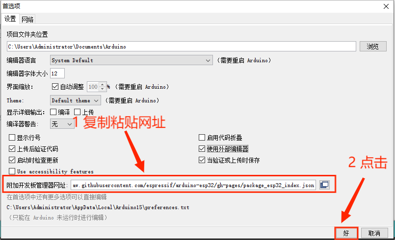 文件→首选项→附加开发板管理器网址,粘贴网址:
