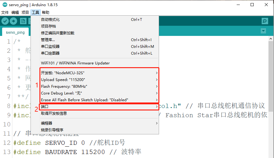 下图是以NodeMCU32S为例,在开发板选择区选择你所用的ESP32开发板的型号及端口号:
