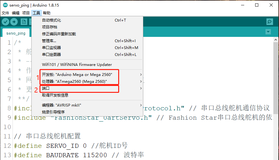 · 选择开发板型号为Arduino Mega2560,选择端口号
