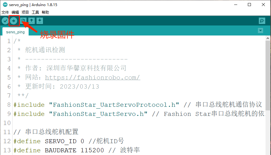 · 在PC端打开Arduino IDE,打开FashionStar总线伺服舵机的例程文件: