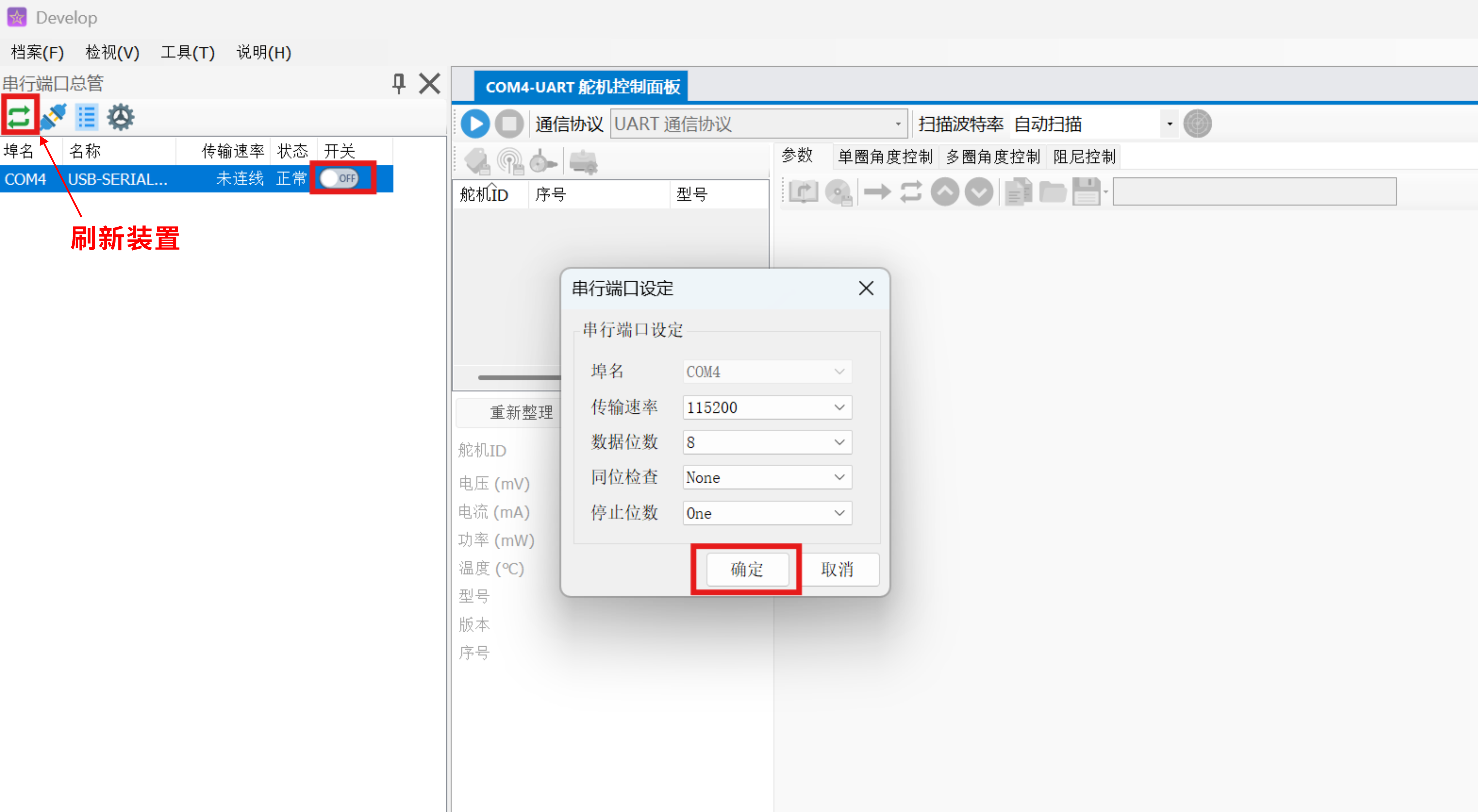 - 点击 确认,软件会再次自动扫描舵机,并在修改的波特率找到该舵机;