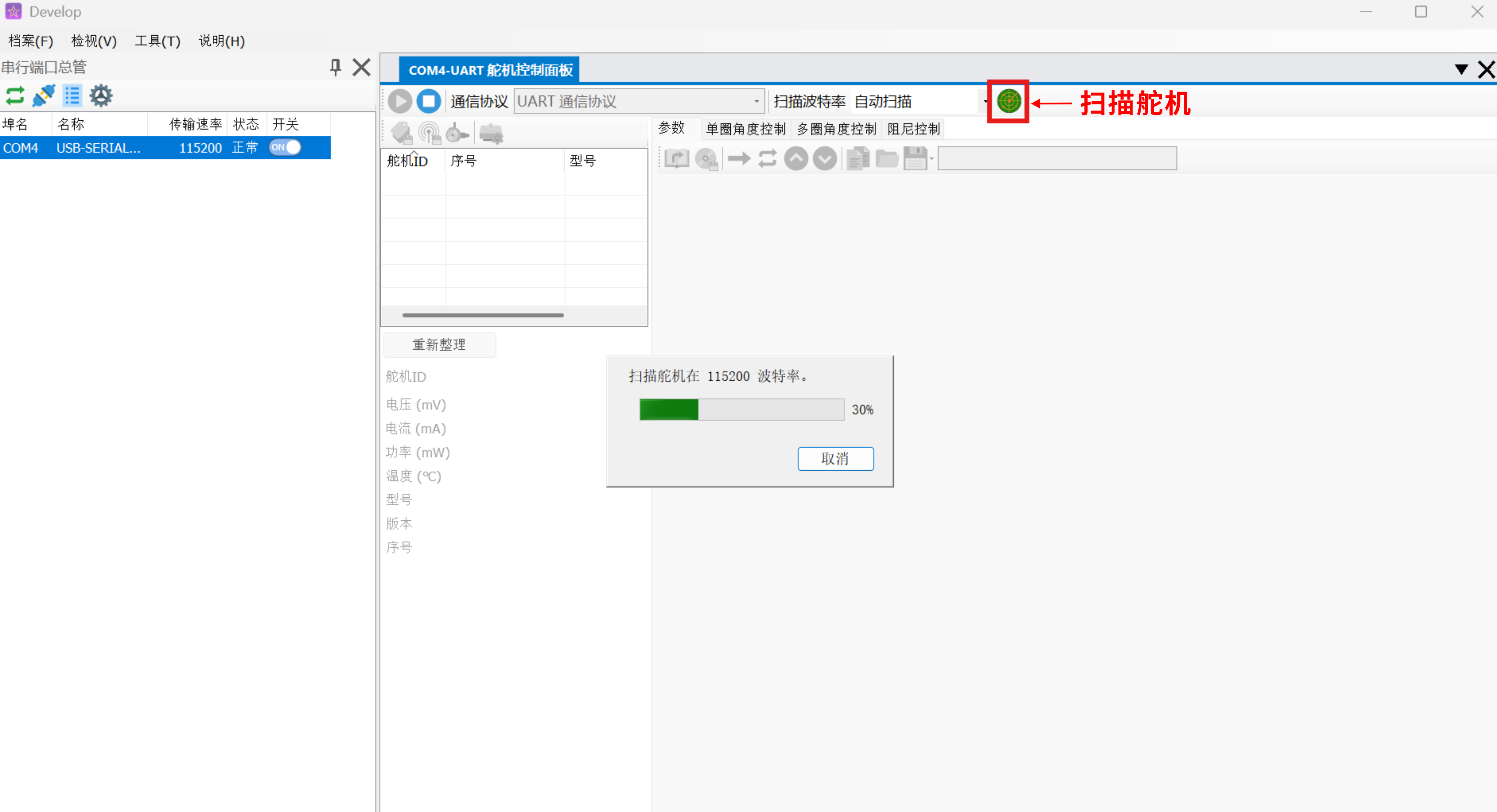 - 1. 点击 扫描舵机 按钮,软件开始自动扫描;