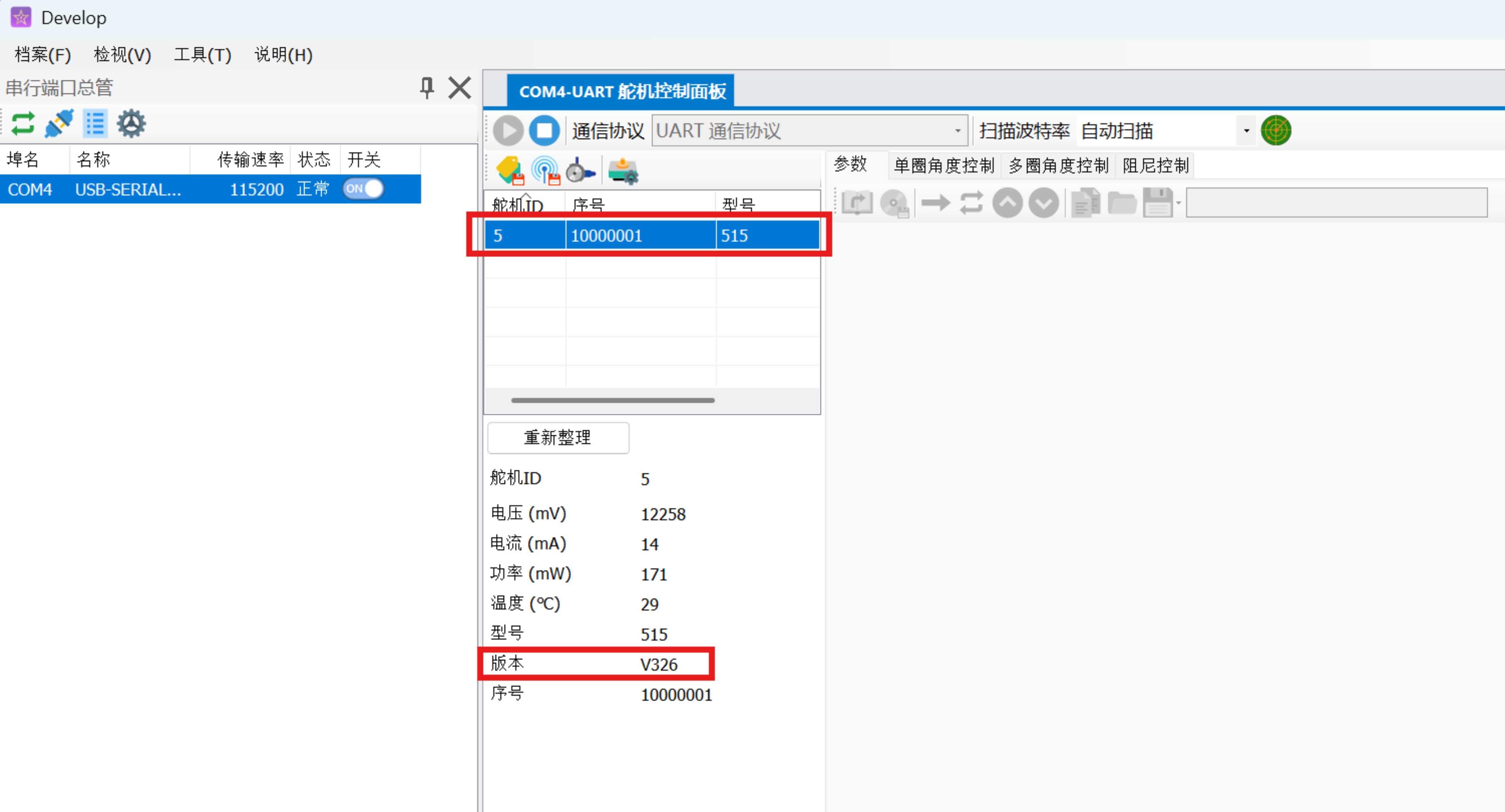 3. 列表中同时显示舵机固件版本信息,便于后续 固件升级 参考。
