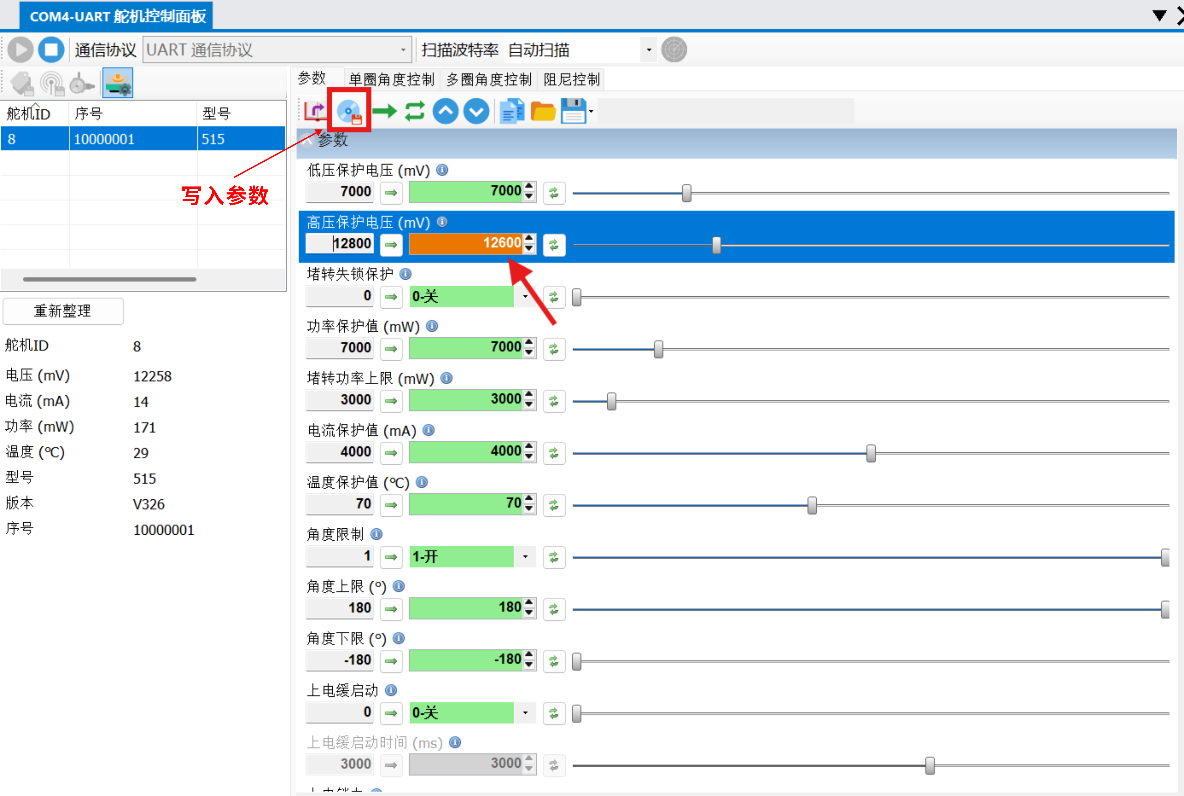 - 参数修改会直接影响舵机保护与运行行为,请在安全工况下操作;